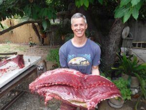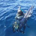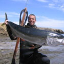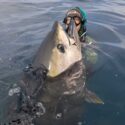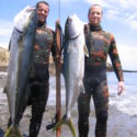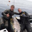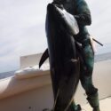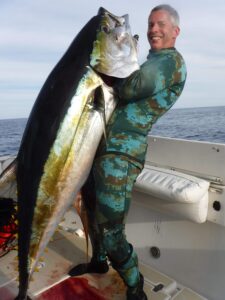 Normally, this can be an extreme workout if the fish is still alive and can last over an hour, as Kevin’s record did. Think about treading water with a full wetsuit on, 20 pounds of weights and speargun while pulling up 200-plus pounds of deadweight or worse and a fish instinctively still trying to get away. Or constantly diving down and swimming to the surface pulling a fish up. One must be in excellent physical shape.