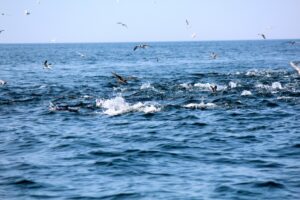 2) Foamers – The adrenaline jumps into warp speed spotting birds diving on bait, and just below are tuna in a feeding frenzy, thrashing violently on the surface — what is known as a foamer. This is fairly easy to spot from a half-mile away with a good set of binoculars. So fishermen will cast the lure or bait into a surface foamer, reel, and this basically masks the lure/bait in the thrashing and is eaten out of aggression.