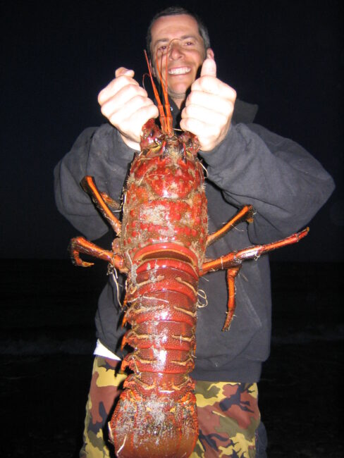 Lobster season was into its first few days when Josh and his friend, Keith Wyer, could not wait to dive for those tasty bugs. They took off from a La Jolla beach at night, and it wasn’t long before Josh found a big ledge and dove down. His dive light spotted many sizable/legal antennae wedged deep inside. He was about to snag a couple when he suddenly felt a hard thump on his head and shoulder.