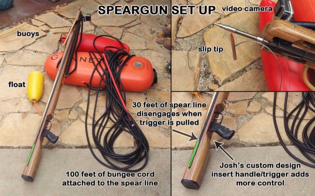 Josh knew that to go after these huge fish, he would need a powerful speargun, heavier float lines, long bungee cords and inflatable floats/buoys.