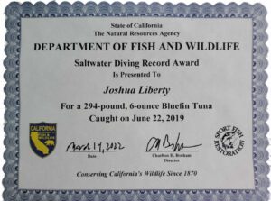 At the landing, the fish weighed more than Kevin’s record of 269 pounds, 7 ounces. Josh submitted the red tape application in July 2019. He then waited almost a year with not a word heard back (they only give you a year to refile). He once again resubmitted in June 2020. Again he didn’t hear back. He thought it got lost in the bureaucratic shuffle because of COVID-19. Then in March 2022, a letter came from the Department of Fish and Wildlife that Josh now held the California State Saltwater Diving Record of a 294-pound, 6-ounce bluefin tuna (along with a nice certificate). He had beaten Kevin’s record by 25 pounds and 1 ounce exactly six years later, same month and date.