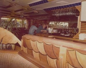 Billy Doyle made the chairs. Back in those days, kegs of nails came in real wooden kegs. Billy turned them upside down, put a deep maroon Naugahyde cover over some foam padding and secured it with brass brads and stained the kegs. Tommy loved the funky look. Later on, the chairs were replaced with captain’s chairs, something that lasted longer as we will learn later. Kitchen equipment was installed.